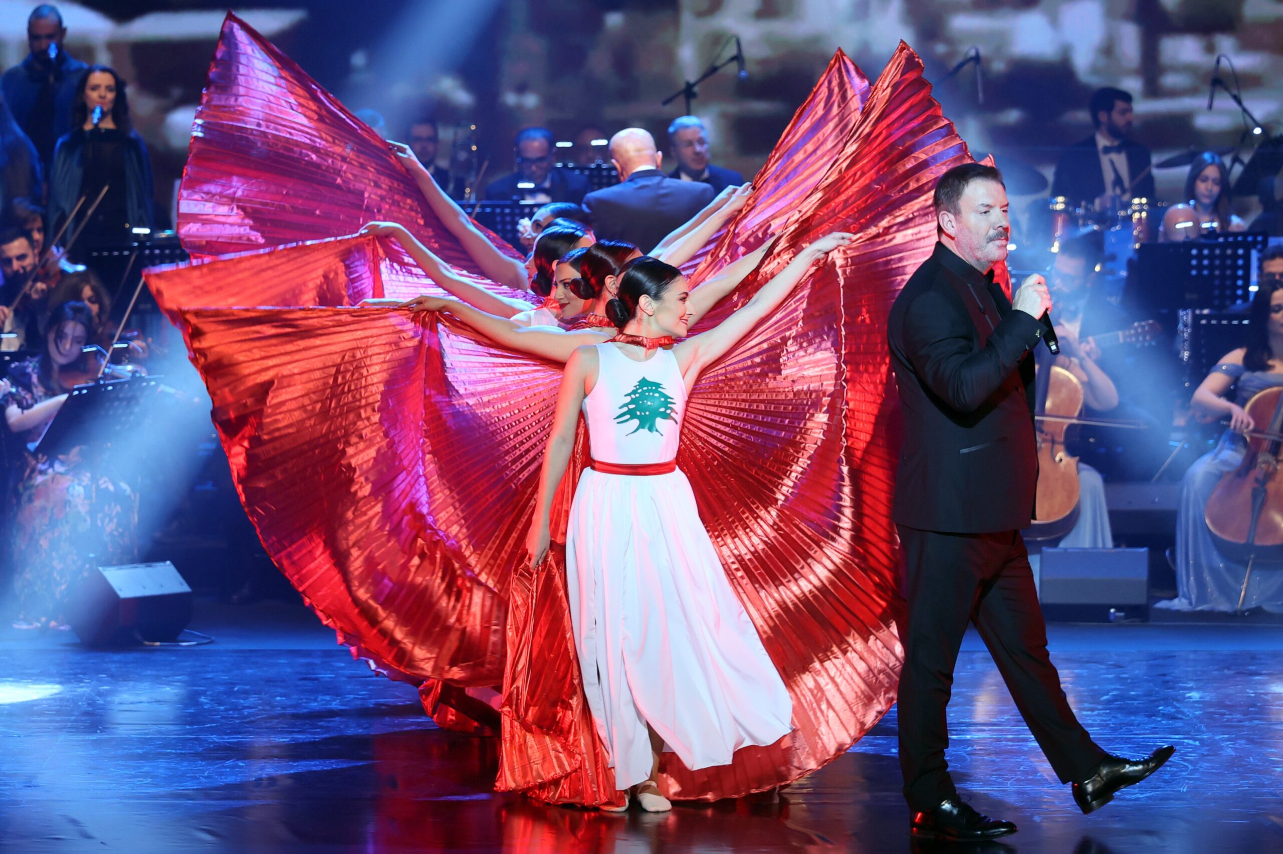 Featuring more than one hundred musicians and dancers on stage, the show delivered a fully immersive musical and visual experience, blending grand theatrical scenes with musical pieces that celebrated the richness of Lebanese identity. The evening opened with stirring patriotic songs and continued with a captivating musical journey across diverse styles and colors, earning praise for its impeccable organization, direction, and breathtaking visual presentation.